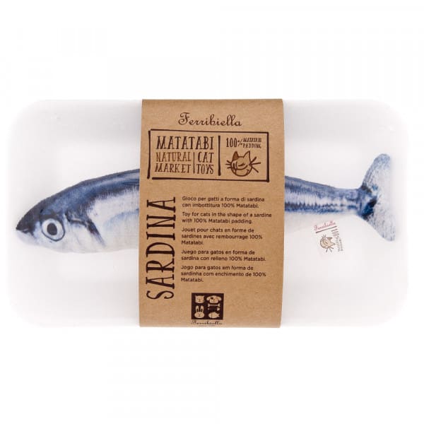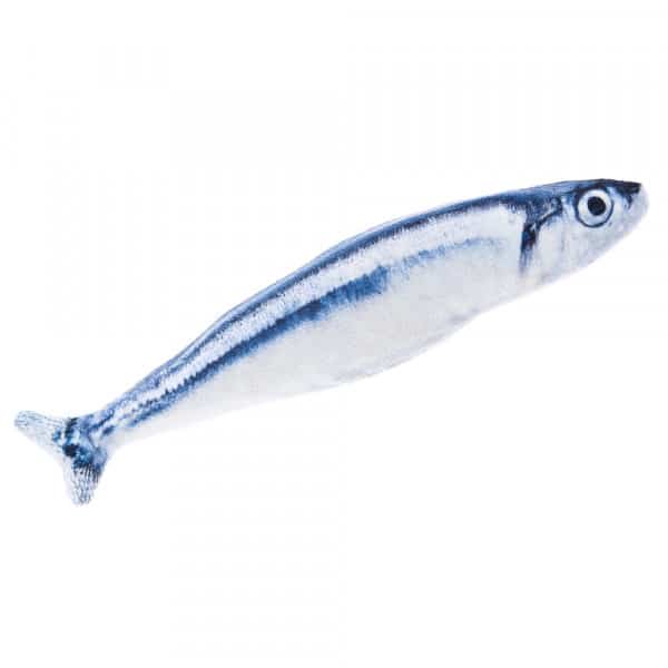 Sardinha em tecido para gatos, com matatabi. Um boneco realista, embalado numa cuvete.